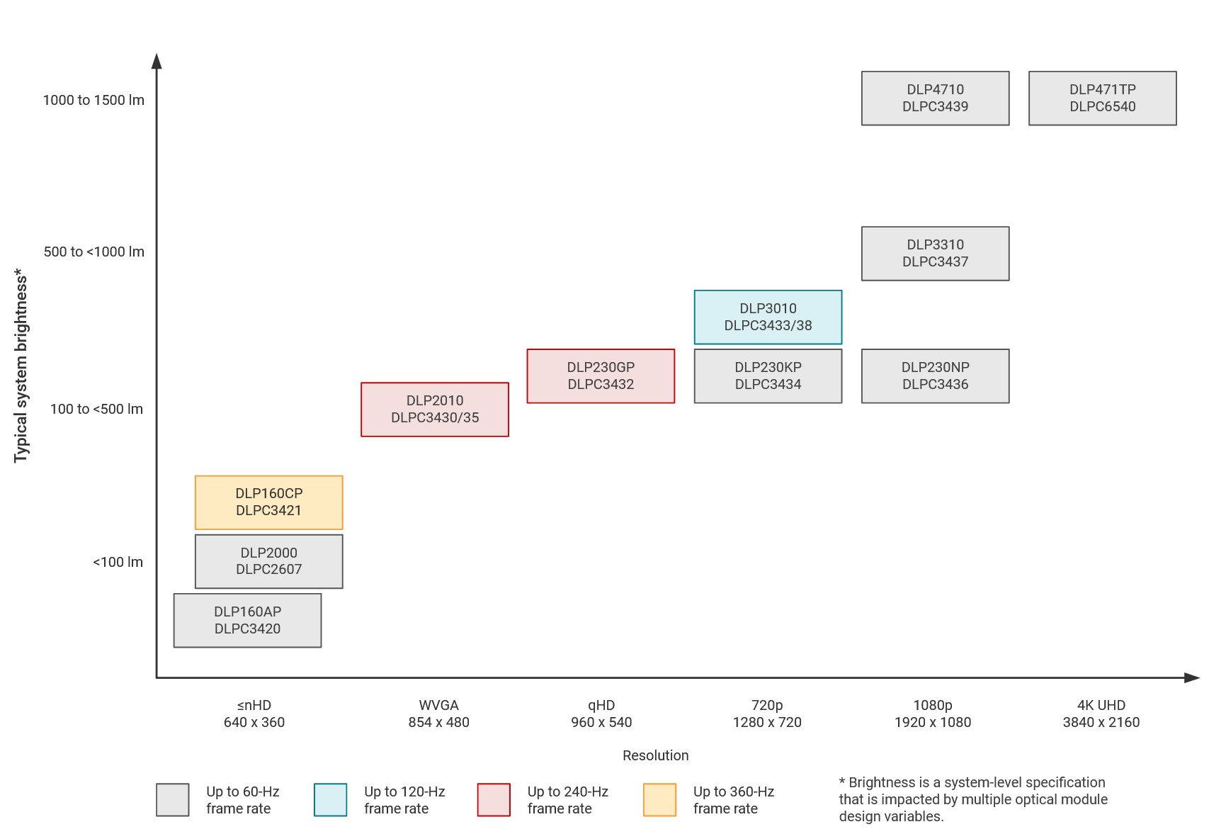 According to Texas Instruments (PDF), minimum image brightness (at the screen – not the LED or lens)