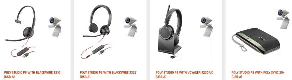 The Poly Studio P5 webcam is a USB-A, 1080p@30fps, 80° FOV webcam that comes in several configurations. These include a mono single-ear headset, stereo headset, a Voyager UC headset and a speakerphone kit.