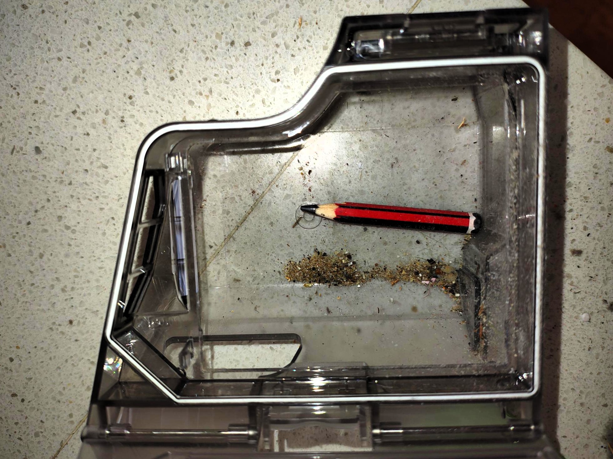 Overall, it found obstacles larger than the minimum size of about 50 x 25cm – a large Lego brick. It sucked our test pencil into the dustbin. It played with a white USB cable for a while and then avoided it.