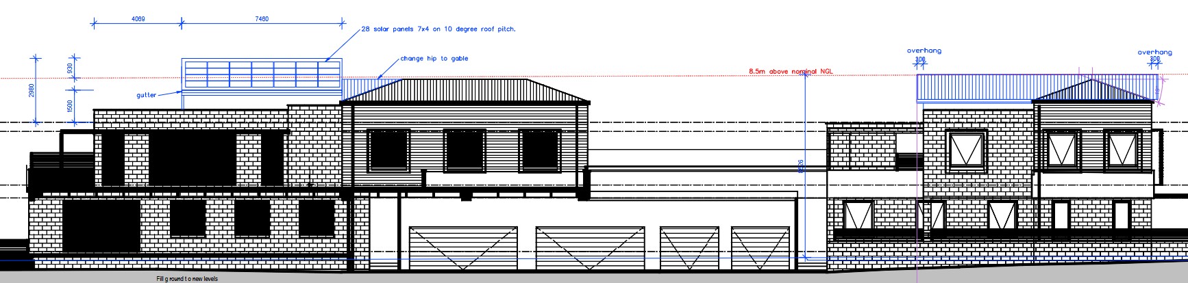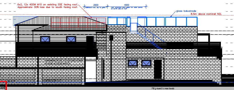 This was to have half the panels at 33° (7 wide x 2 deep) and half at about 20°. While that met roof height levels, it was not approved as it would have created a roof over the roof garden, essentially a third level, and there is a maximum of two levels in our area.