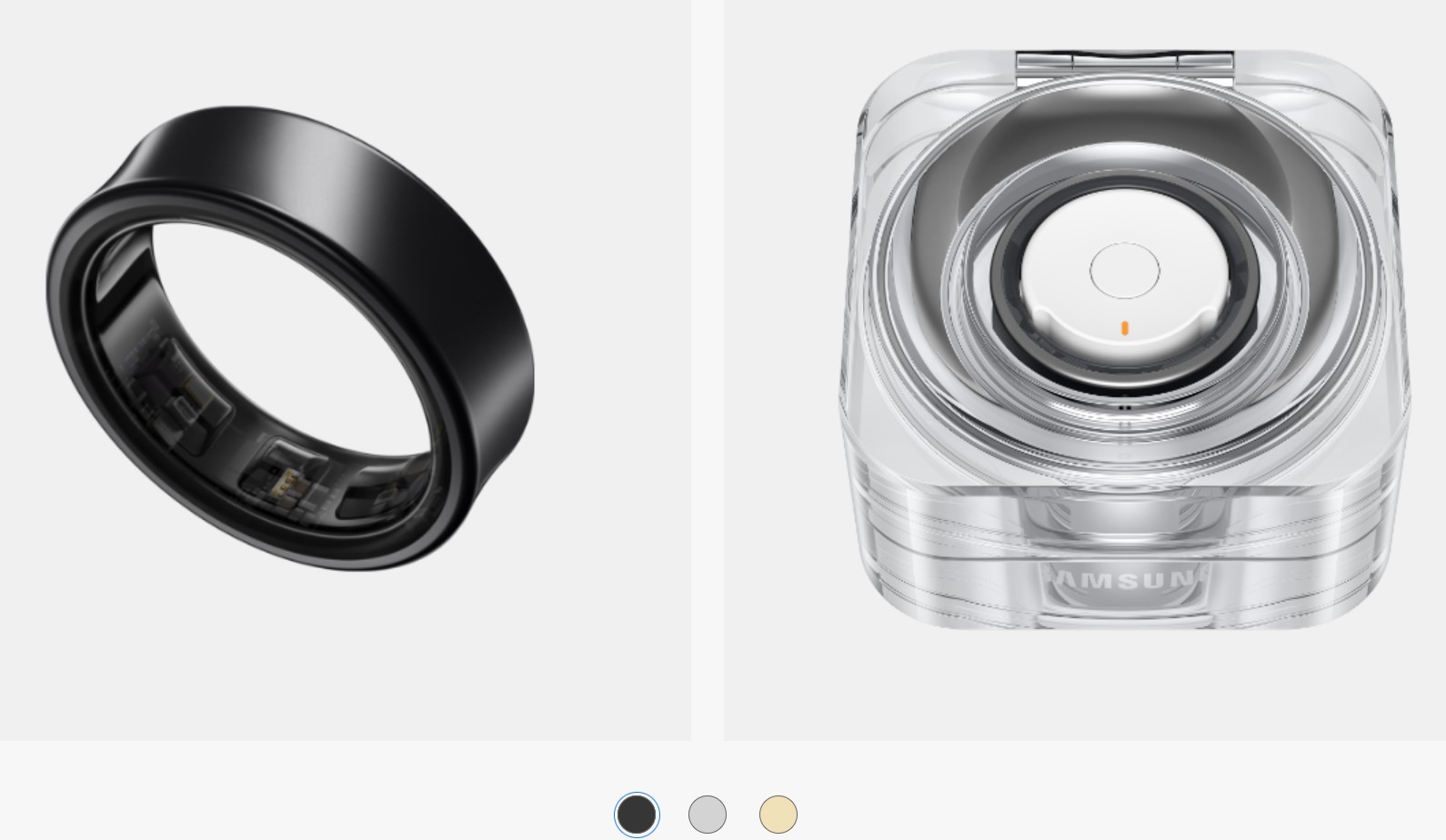 It comes in a typical Samsung matte black recycled cardboard box. Inside is the clear Perspex ring box/charger—small at 48.9 square x 24.5mm x 61.3g (plus ring from 2.3-3g). It comes in black, silver, or gold.