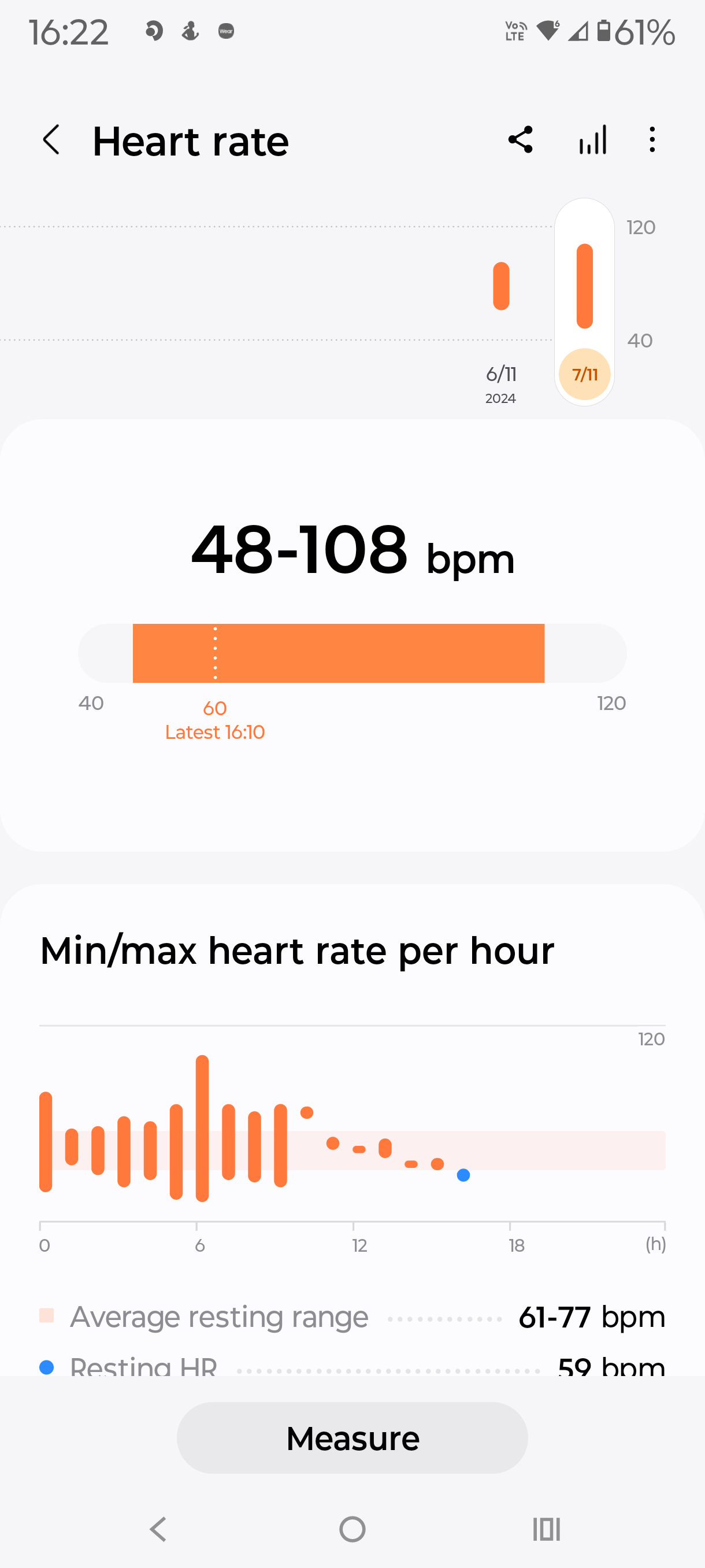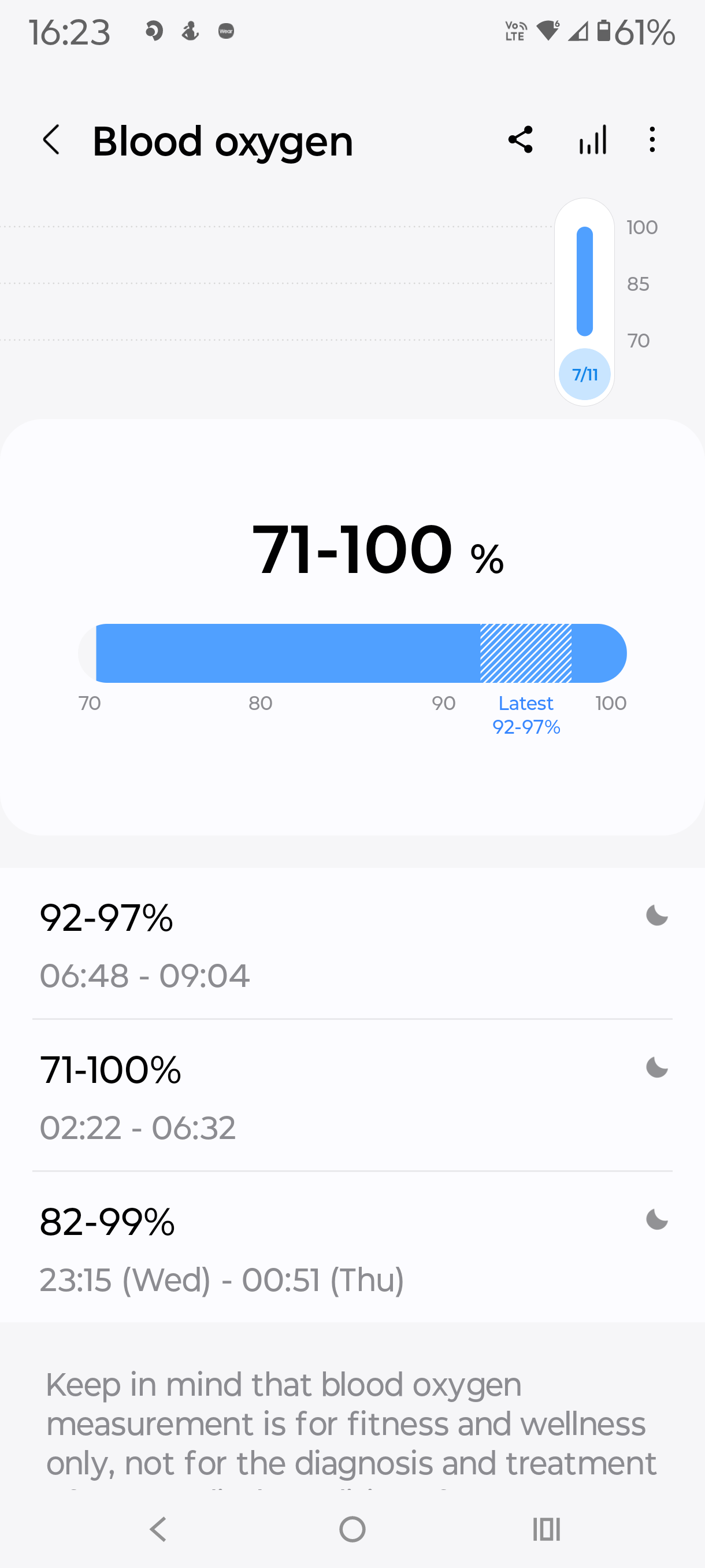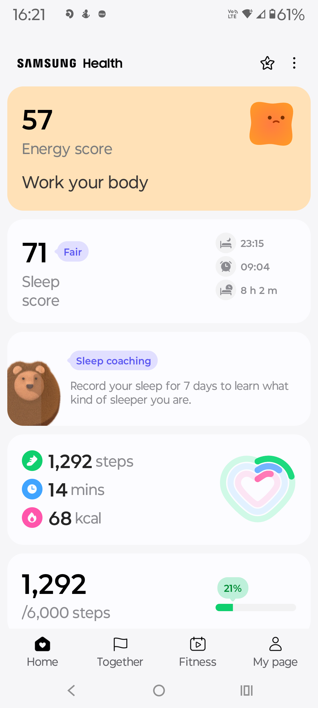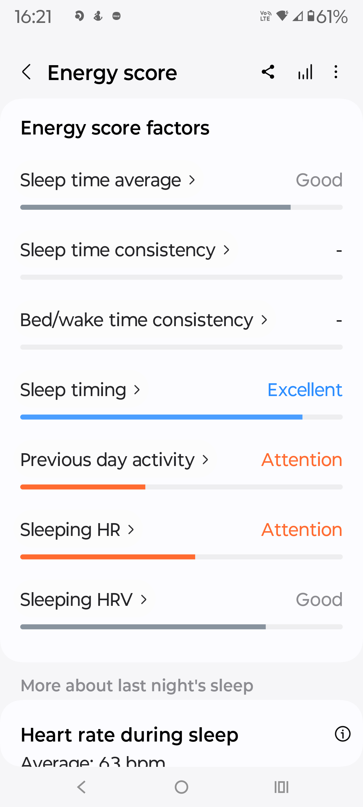 Off to bed and to track sleep. I suffer from bad hay fever, and that night was terrible, punctuated with regular bouts of explosive sneezing. Samsung recorded total sleep time, physical recovery (which showed why I was tired the next day), restfulness (not enough), mental recovery (poor) and other sleep facts. Overall, sleep tracking is good – perhaps not detailed enough.