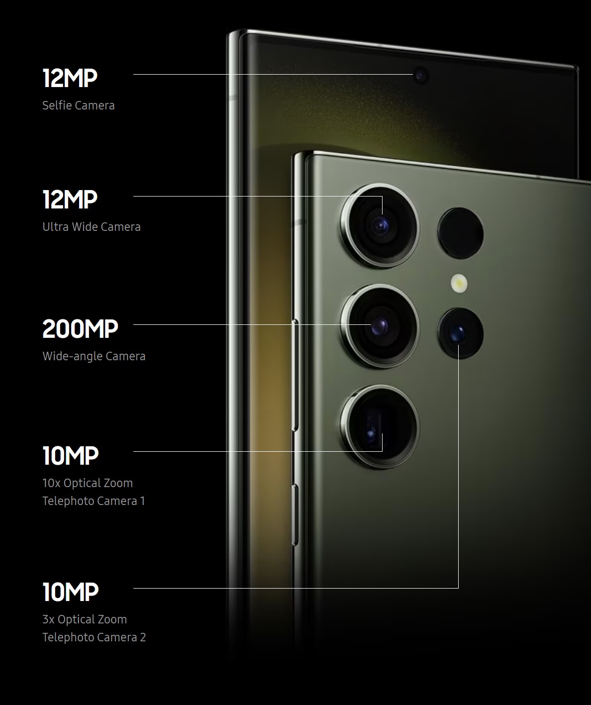 - 200+10+10+12MP+Laser Focus, Wide/3X Telephoto/10X, Telephoto/100X Space Zoom/Ultra-wide and 12MP selfie and premium photography features.