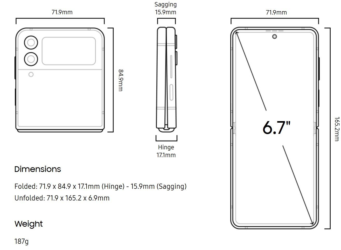 | Size (H X W x D) | 165 x 71.9 x 6.9mm flat 85.9 x 71.9 x 15.9-17.1mm folded |