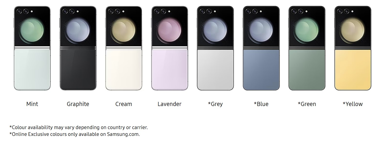 | Colours | Standard colours: Mint, Graphite, Cream, Lavender Samsung Online Exclusive colours: Grey, Blue, Green and Yellow |