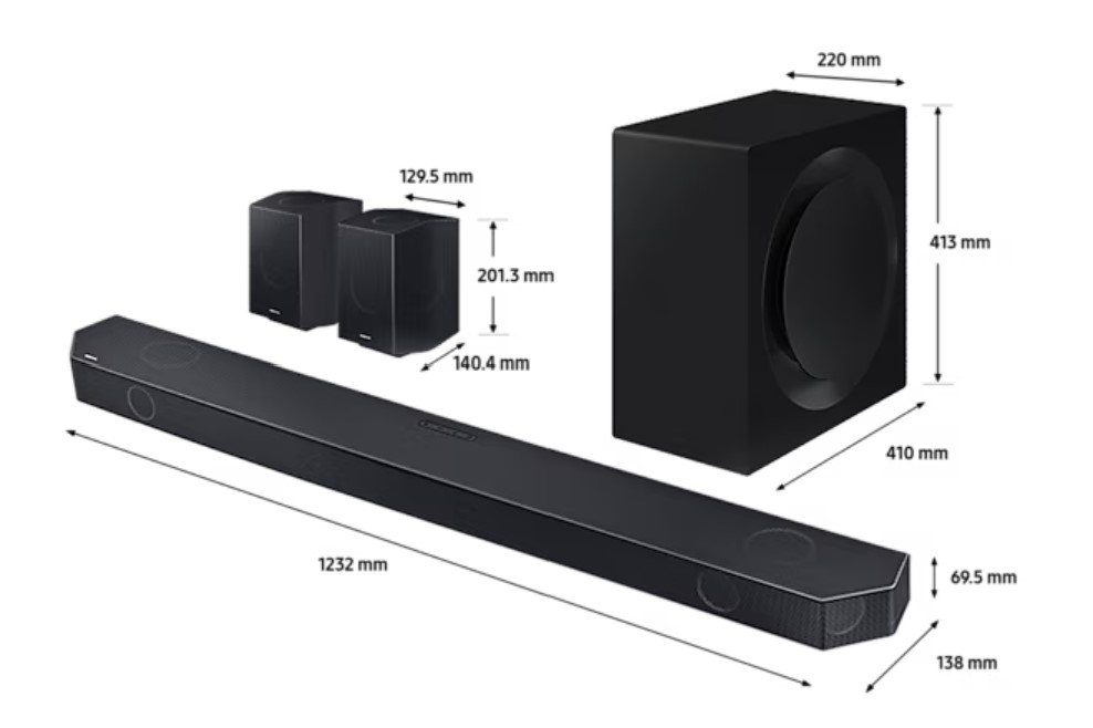 The Samsung Samsung HW-Q990C soundbar is imposing at 1232.0 x 69.5 x 138.0 mm x 7.7kg, the sub-woofer 220.0 x 413.0 x 410.0 mm x 11.7kg and the two wireless rears each 129.5 x 201.3 x140.4 mm x 3.4kg. It is covered in steel acoustic mesh. It is not elegant – straight down to business.