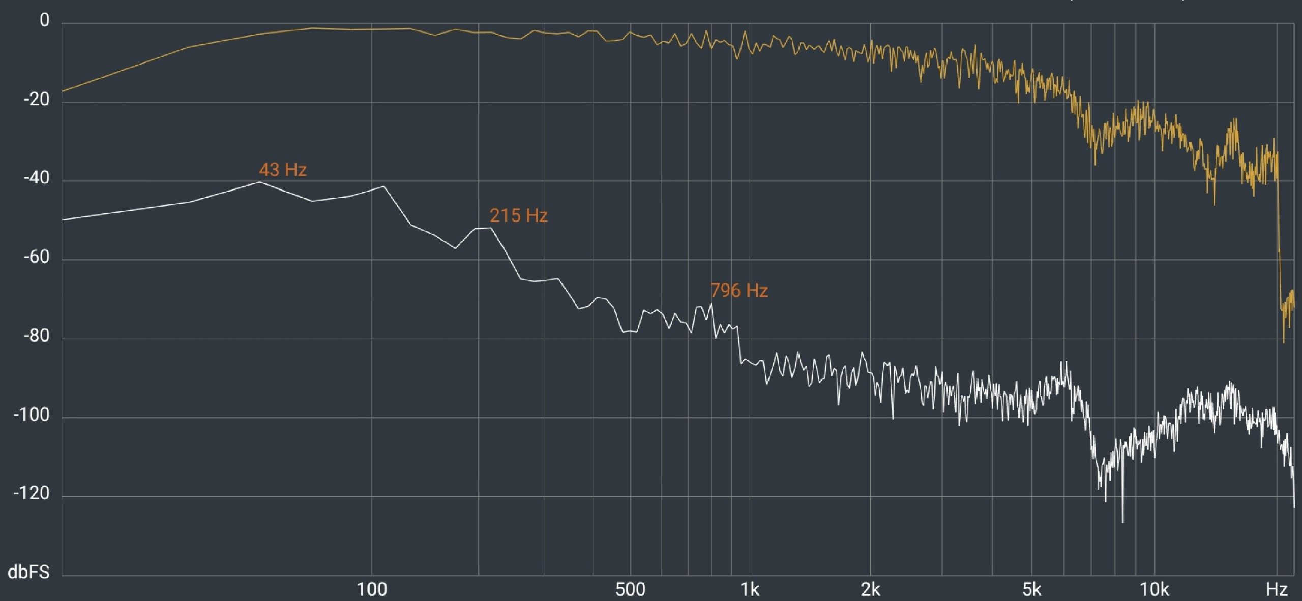 Low bass (room shaking) starts around 30Hz and builds solidly to mid-bass (50-70Hz), where it is flat (good) to 8kHz, where it dips slightly to avoid harshness and is then flat to 20Hz.