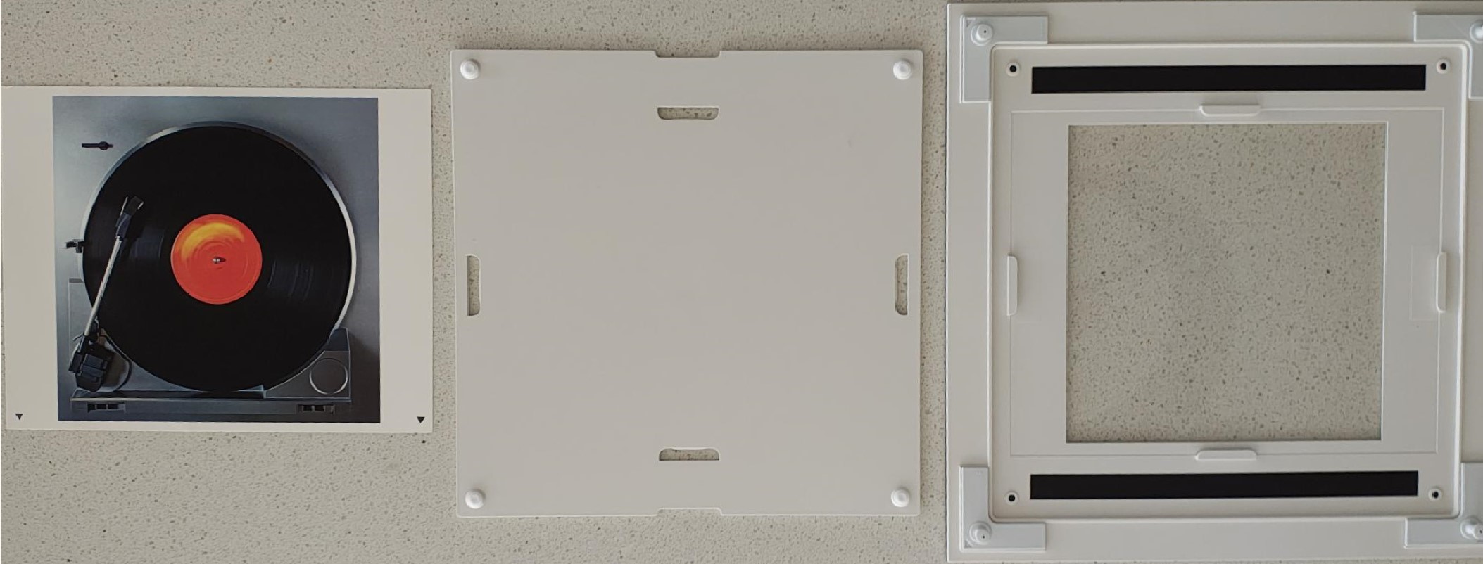 It has a substantial 330 x 330mm non-reflecting glass picture ‘cover’ attached to the speaker via corner posts. The image cutout accommodates a 195 x 195 photo in a 255 x 205 matt.
