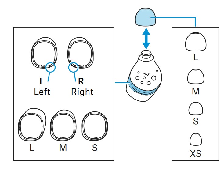 The silicon ear tips come in XS, S, M, and L. The wings come in S, M, and L and aid passive noise reduction with a good fit in your outer ear’s concha.