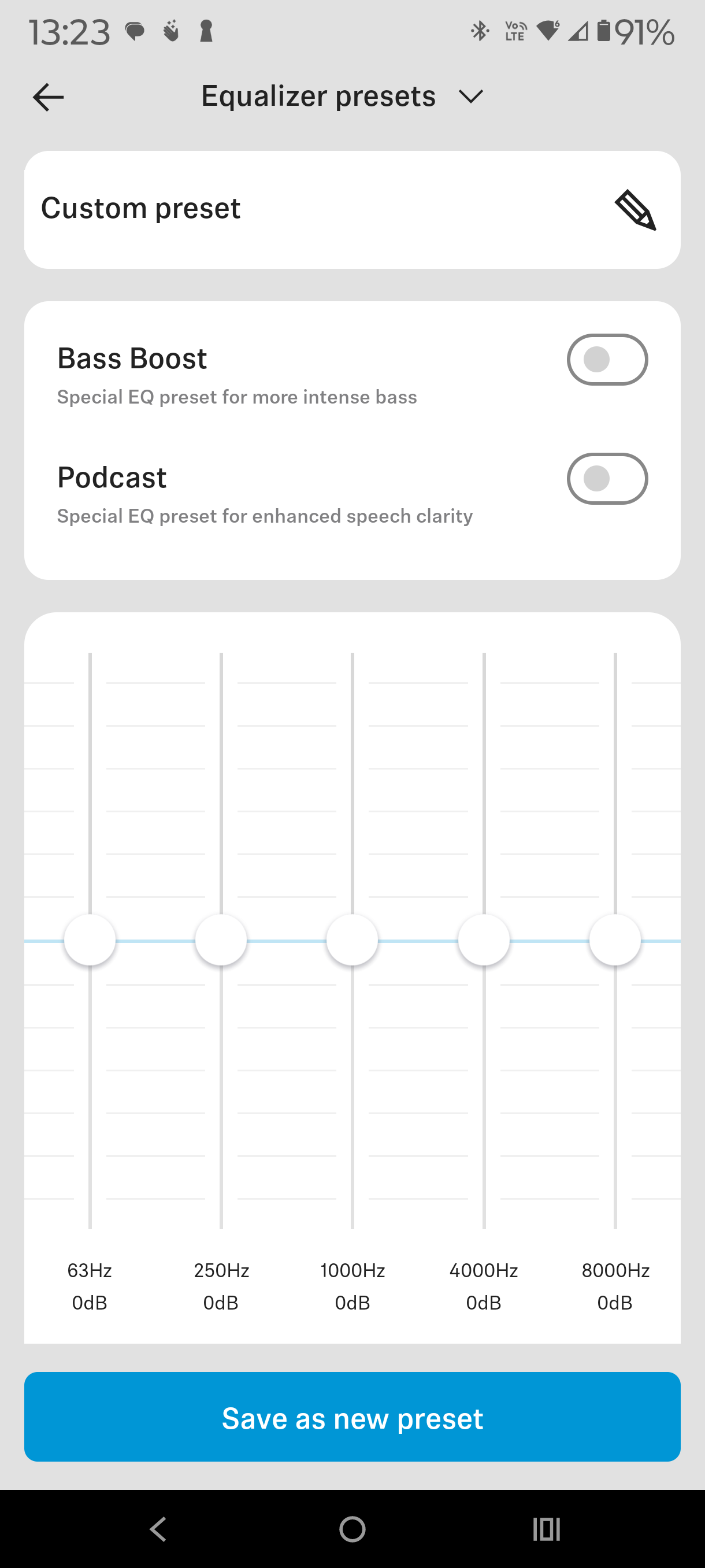 The app equaliser (EQ) can recess (not boost) any frequency. The only two presets are Bass Boost and Podcast.