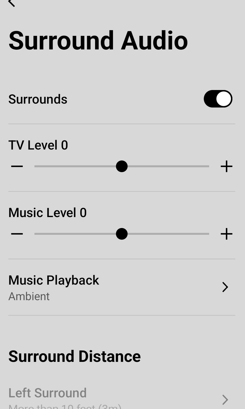 • Set the Music level at 50% (for streaming music and does not affect TV) and the music playback to Ambient. This means the rears supplement the soundbar, and if you set it to full, the speakers become quasi quadrophonic rears.
