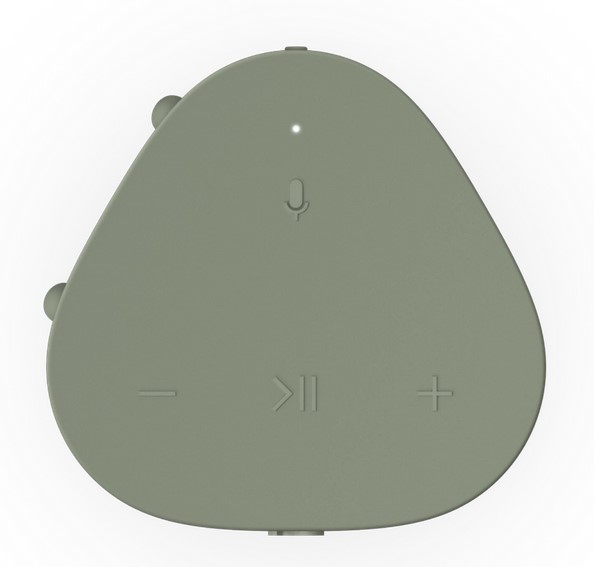 The top has +/- Volume (6 rings), music play/pause/next rack, microphone on/off, and LED.