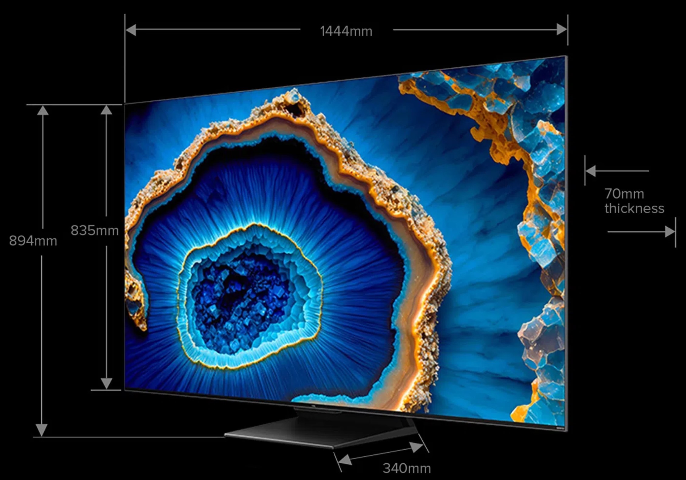 It is 1444 (W) x 894 (H) x 340 (D) x 22.1kg with stand and 1444 (W) x 835 (H) x 70 (D) x 20.2kg without.