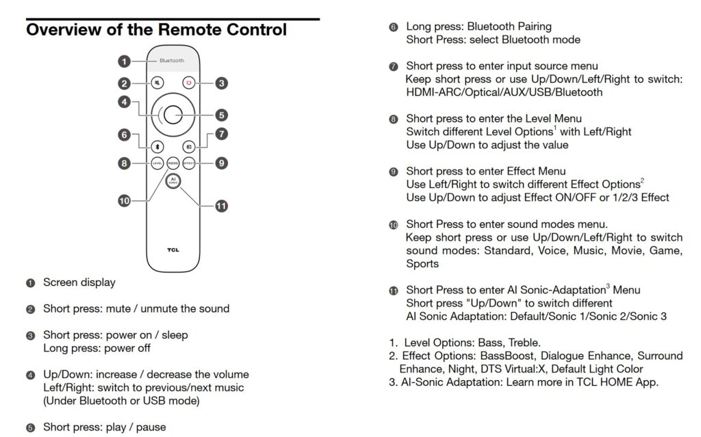It is a typical 3.1 all-in-one with a sub-woofer. TCL gains points for the two crossover tweeters to handle the upper mid and treble. With the caveat that you don’t push its volume to the max, it is quite a good all-around soundbar.