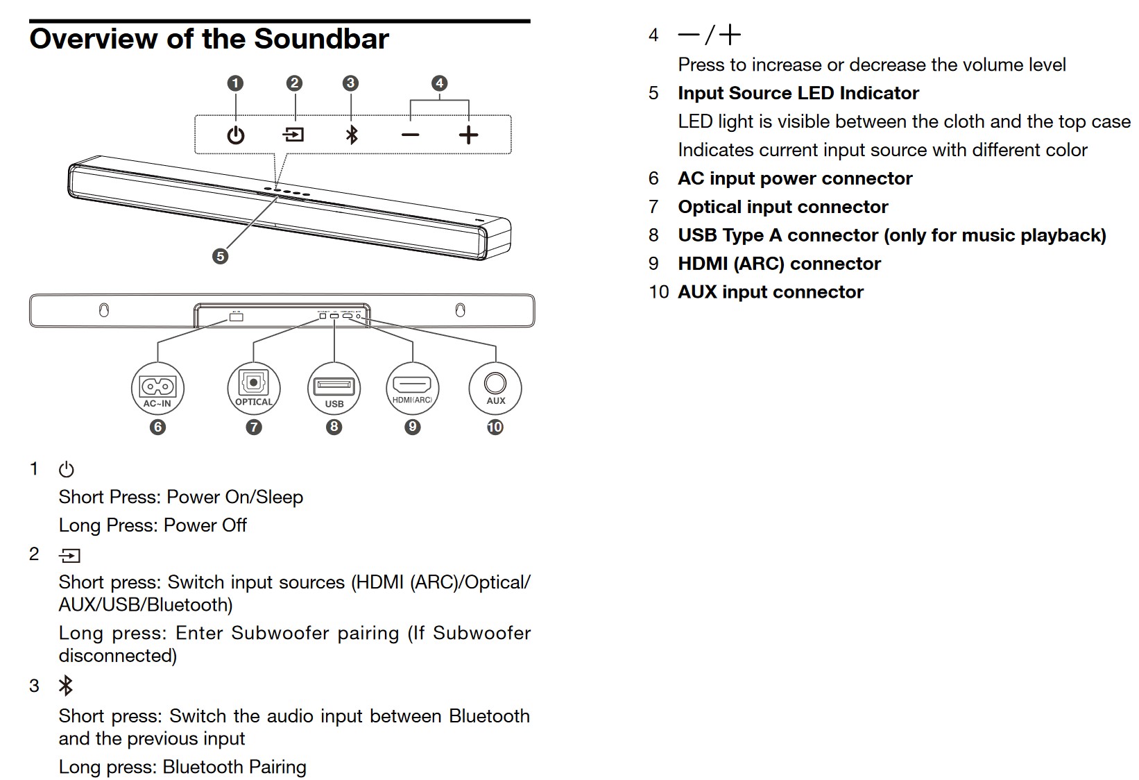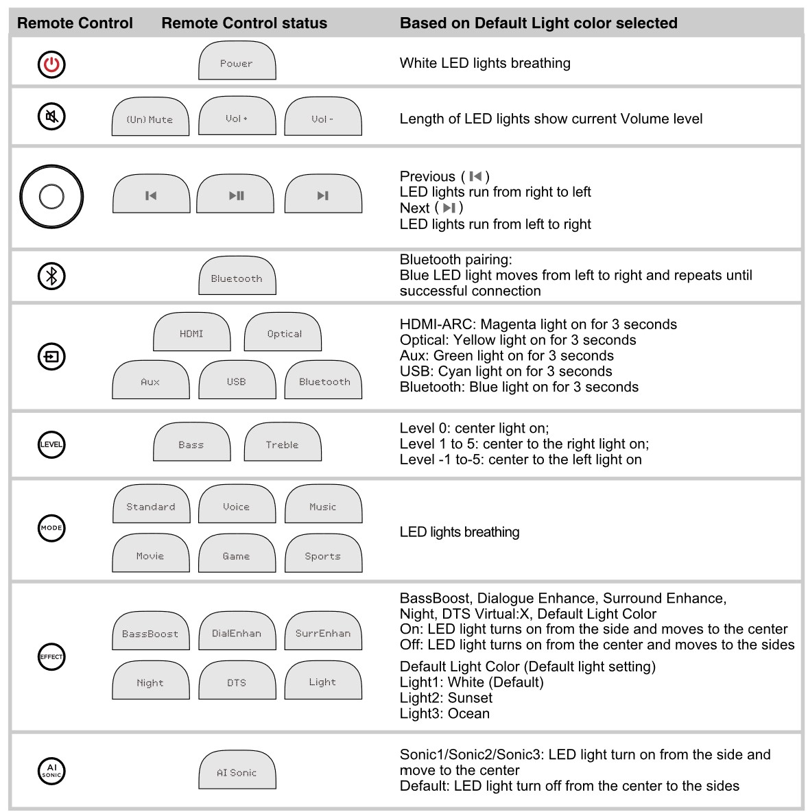 The surface of the soundbar is matte dark grey ABS, with a dark grey acoustic textile across the front. It has a LED bar at the top centre, which pulsates and glows in different colours depending on the mode. On top is power, input source (BT, Optical or HDMI – no Wi-Fi or Ethernet), BT pairing, and +/- volume.