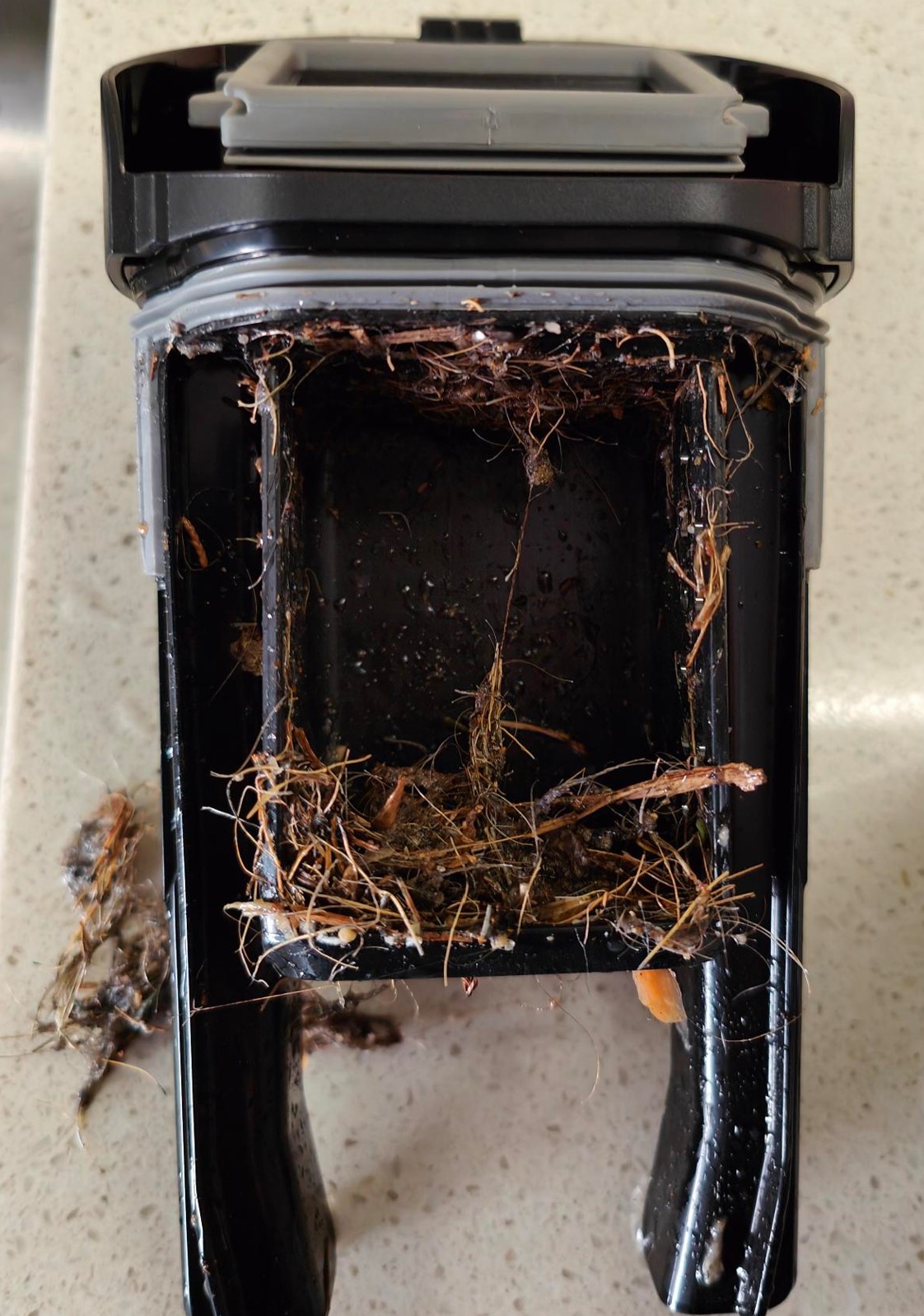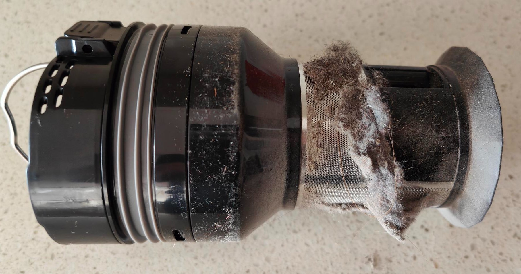 We then managed to vacuum 45m2 of carpet and wall edges before exhausting the battery. Its claim of 65 minutes of vacuum time on defaults is verified.