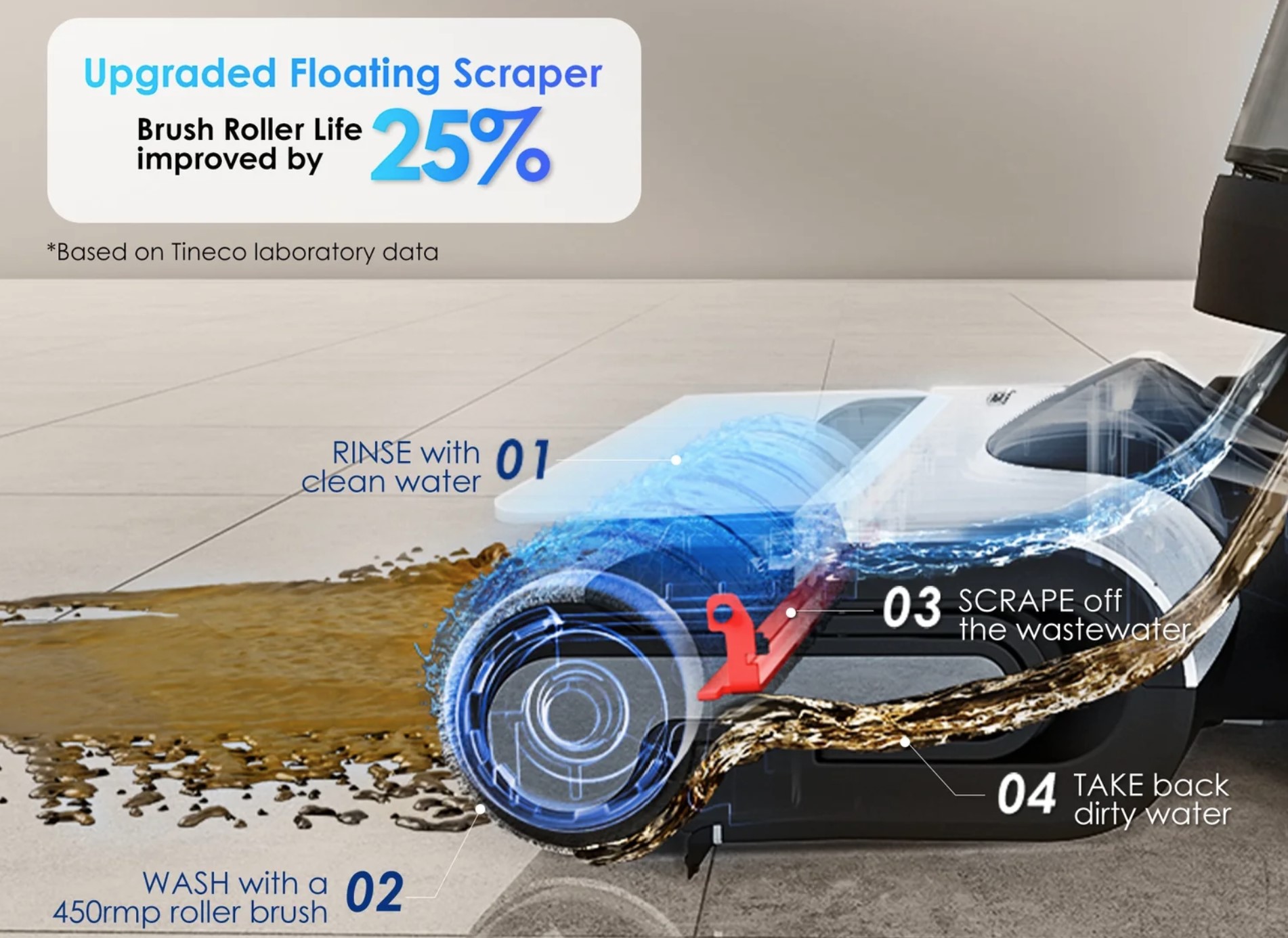 Subjectively, it vacuums/mops as well as its siblings, with the identical 450RPM roller and edge cleaning ability on both sides. It automatically adjusts water delivery from 20 to 100ml/min.