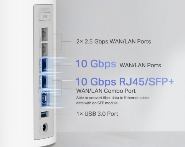 - 10Gbps RJ45 WAN/LAN, 2 x 2.5 Gbps and 1 x 10 Gbps LAN