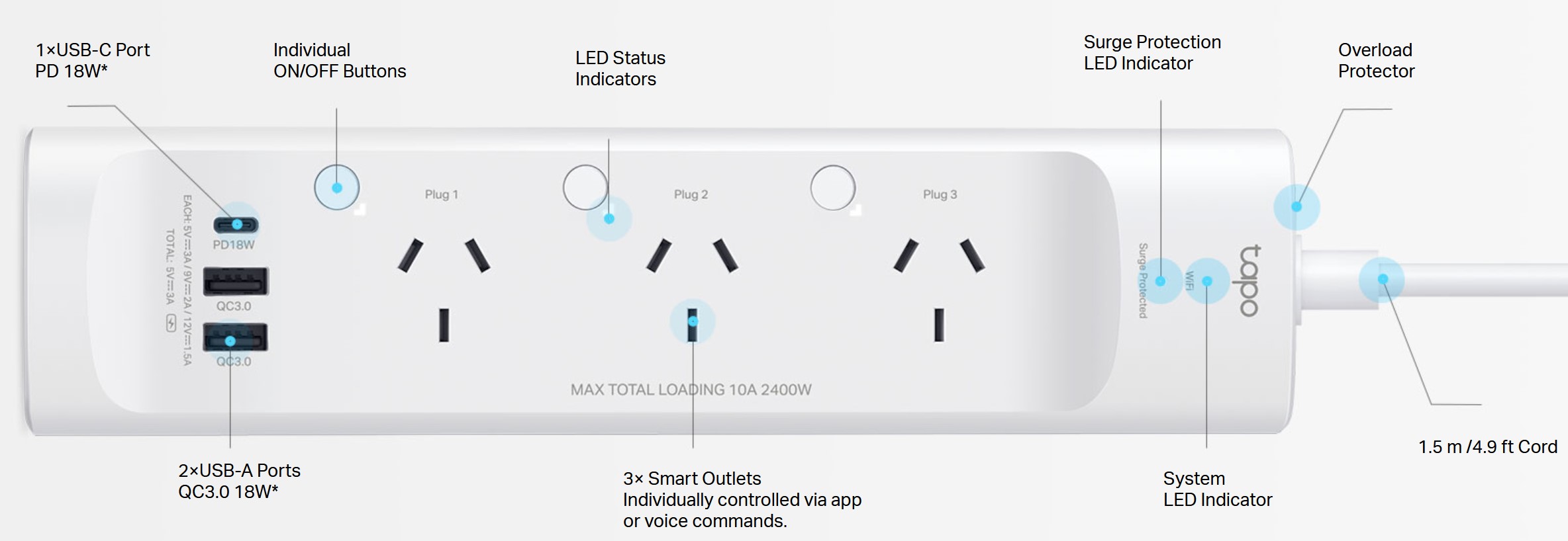 Think of it as three individually controllable smart plugs you can turn on or off manually via the App or voice assistants. As a bonus, it has 2 x USB-A QC 3.0 ports (5V/3A/15W or 12V/1.5A/85W) and a USB-C 18W port – these are not Wi-Fi controlled.