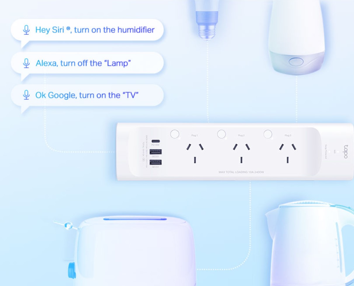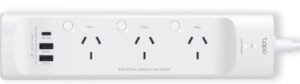 The TP-Link Tapo P300 smart Wi-Fi power board has three 240V smart plugs, 2 x USB-A QC 3.0 ports and a USB-C PD18W port. It can also be voice-controlled.