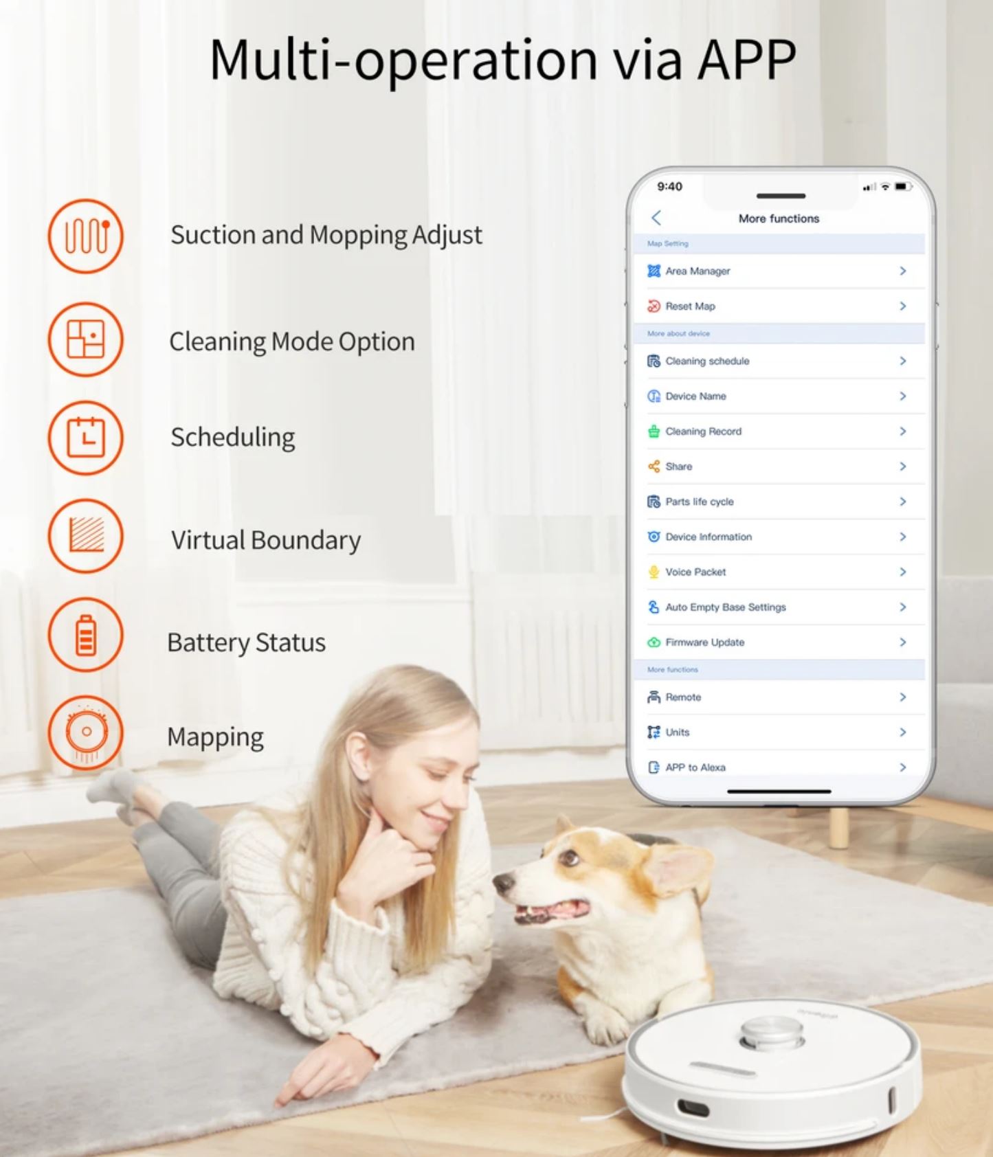 The App is the best way to activate it and select different modes. Using voice control loses a lot of functionality – basically, start cleaning or cleaning a named room.