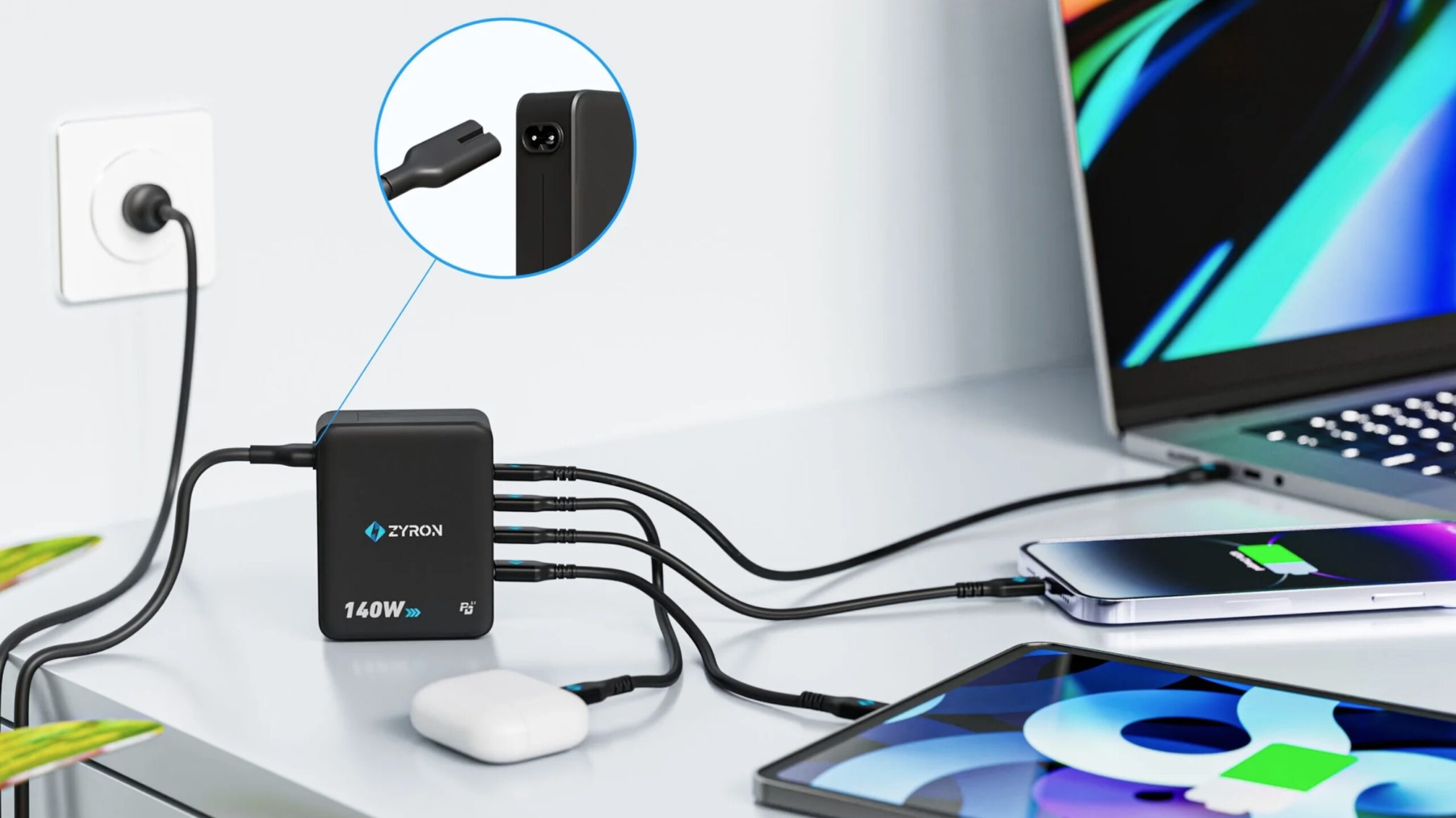 The Zyron PowerPod 140W PD 3.1 is a 4-port travel charger capable of delivering 140W USB-C charging or 140W spread over four ports.