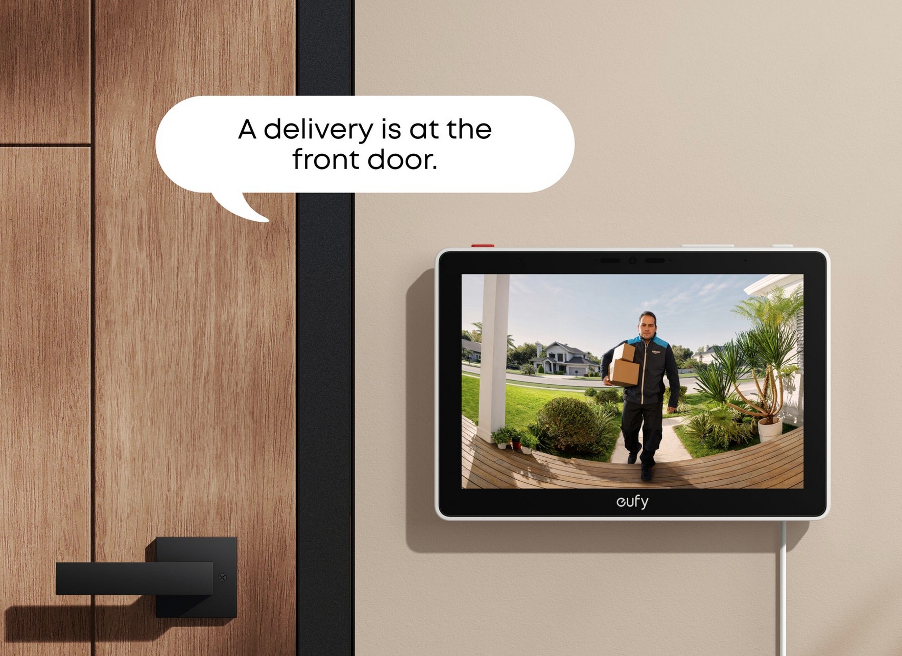 - Hands-free door alerts: When someone rings the doorbell, unlocks the door, or is detected by the camera, the display automatically lights up with a live feed and a voice alert.