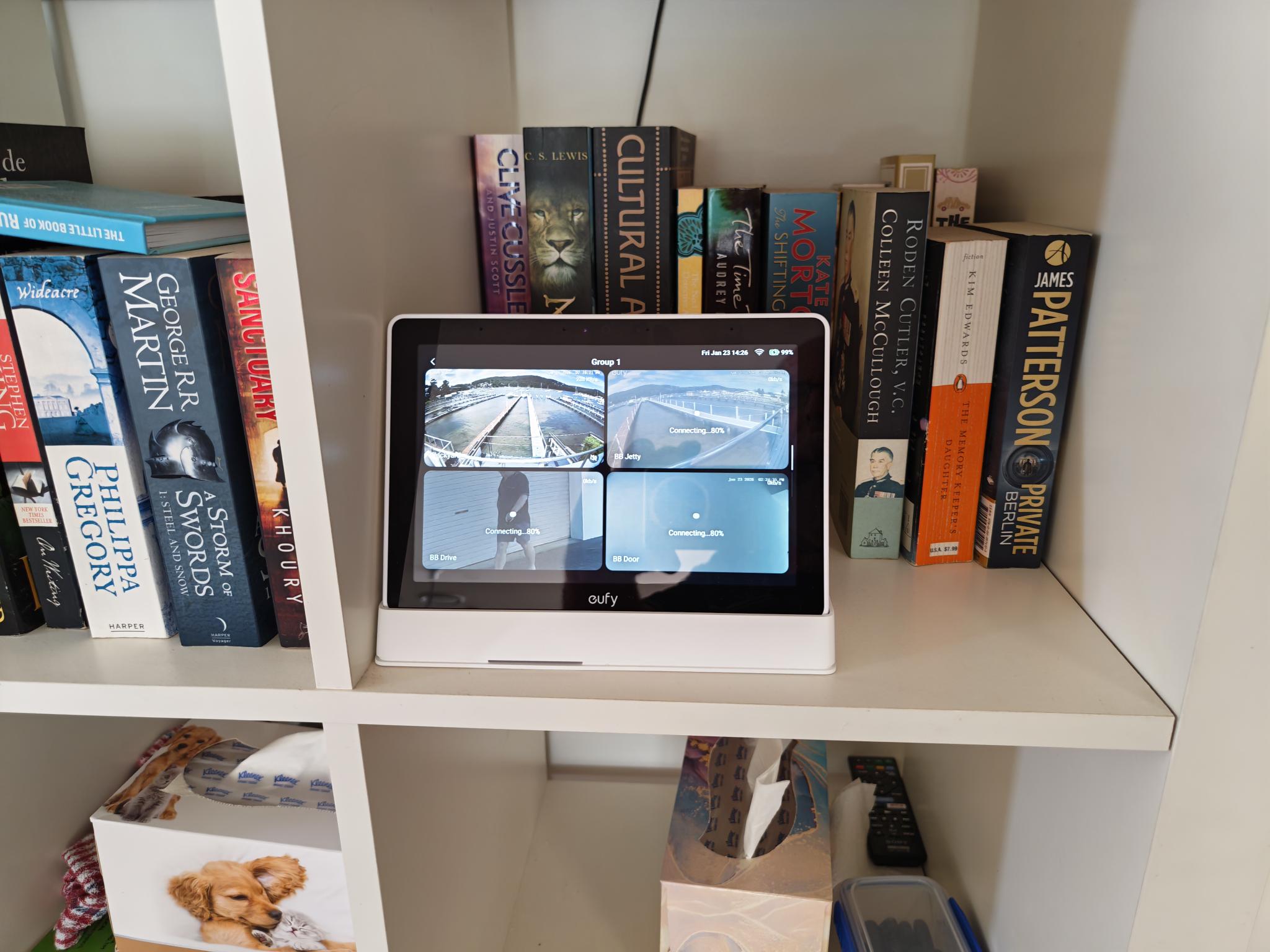 This relatively inexpensive 8” screen and dock connects wirelessly to the 2.4/5GHz Wi-Fi (so it is easy to move) and brings together your eufy video security products.