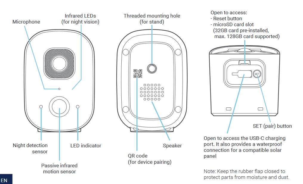 And yes, it’s a typical camera. White ABS casing, USB-C (or solar charge and for $10 more, you would be crazy not to get it), with a ¼” tripod mount on the back or a flat bottom for desktop. It has a tripod wall mount in the box.