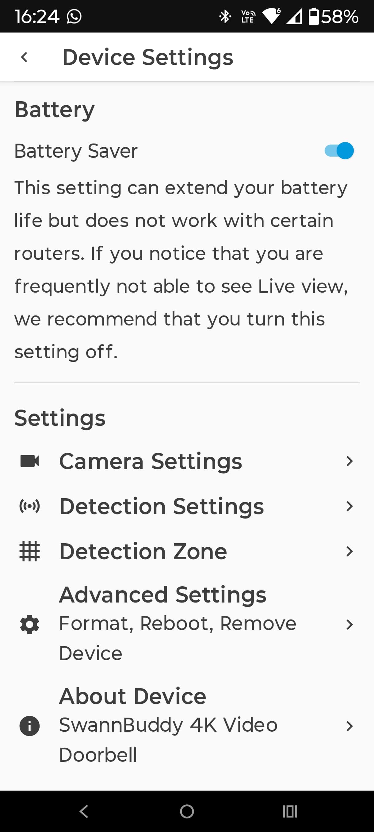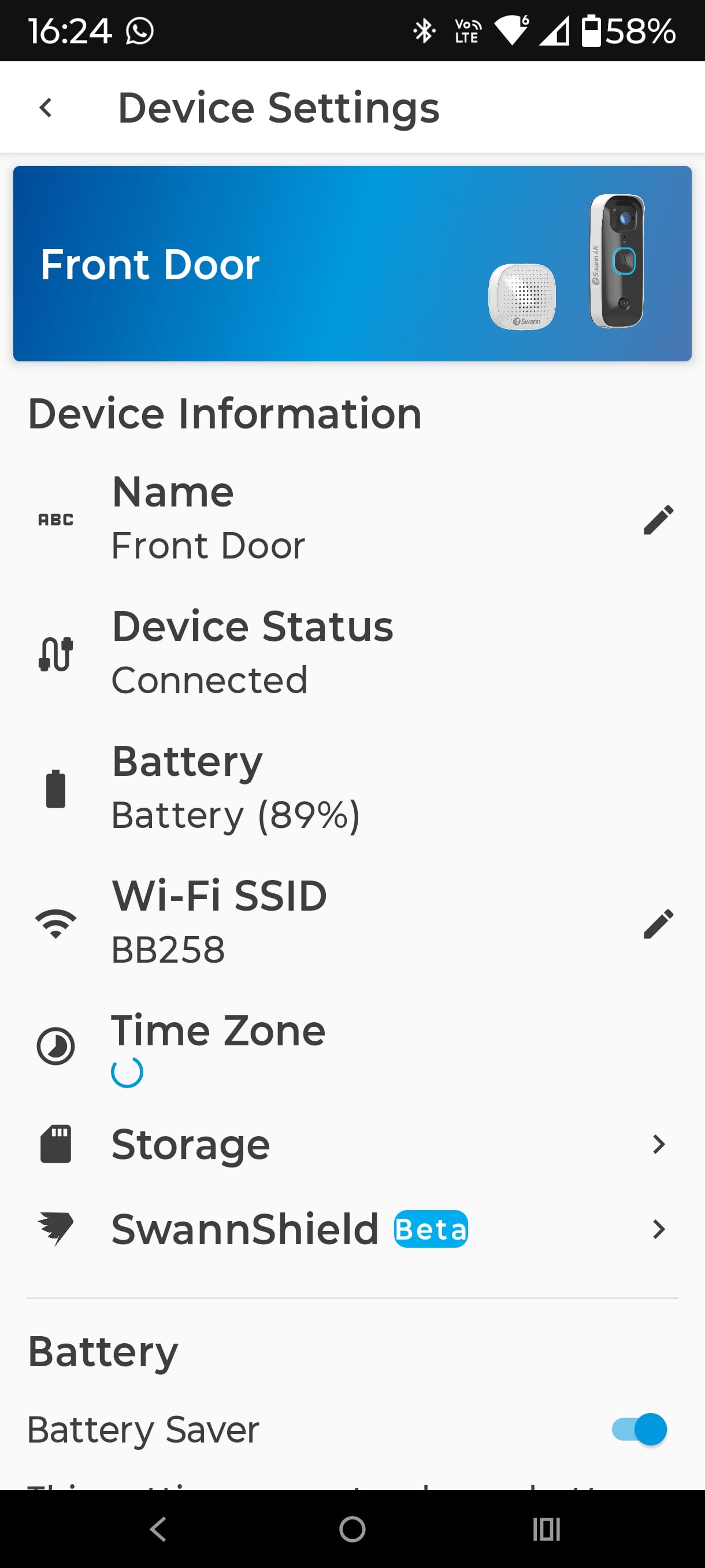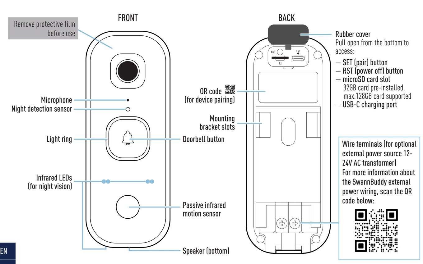 Swannbuddy has a 6,500mAh battery that should give two to three months of typical use. Recharging is via USB-A to USB-C 5V/2A/10W (cable but no charger supplied). Charging takes up to six hours. Or you may be lucky and be able to use the existing doorbell wiring, but you may need a sparky to tell you that.