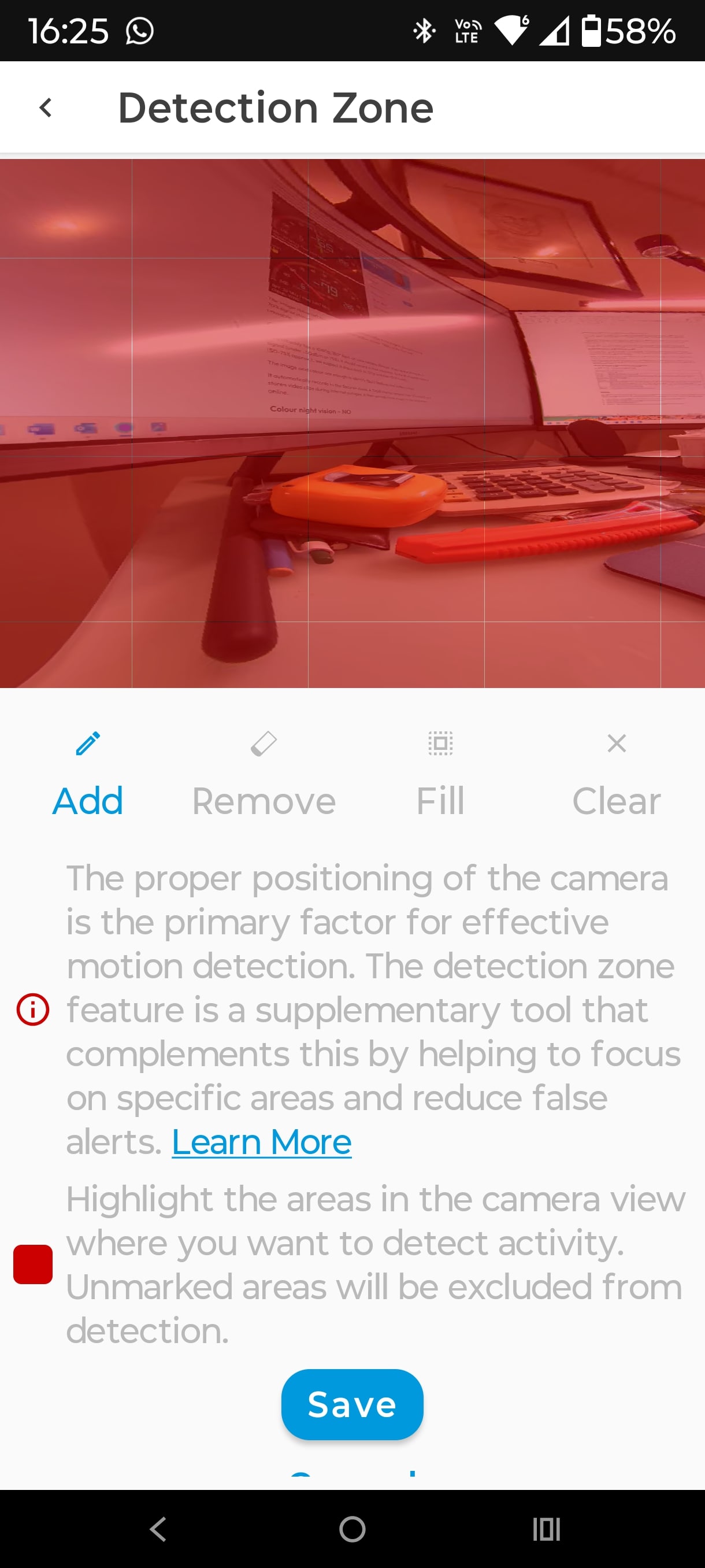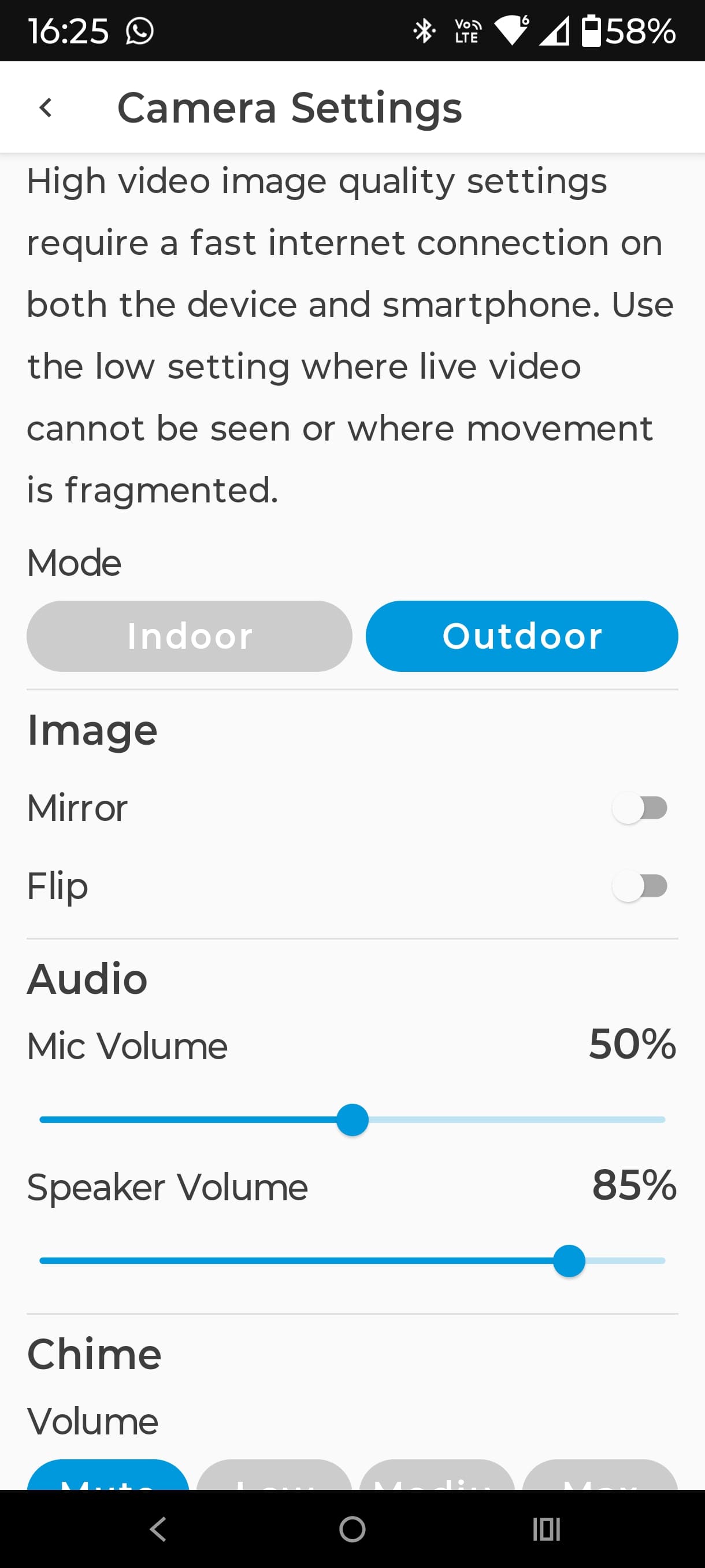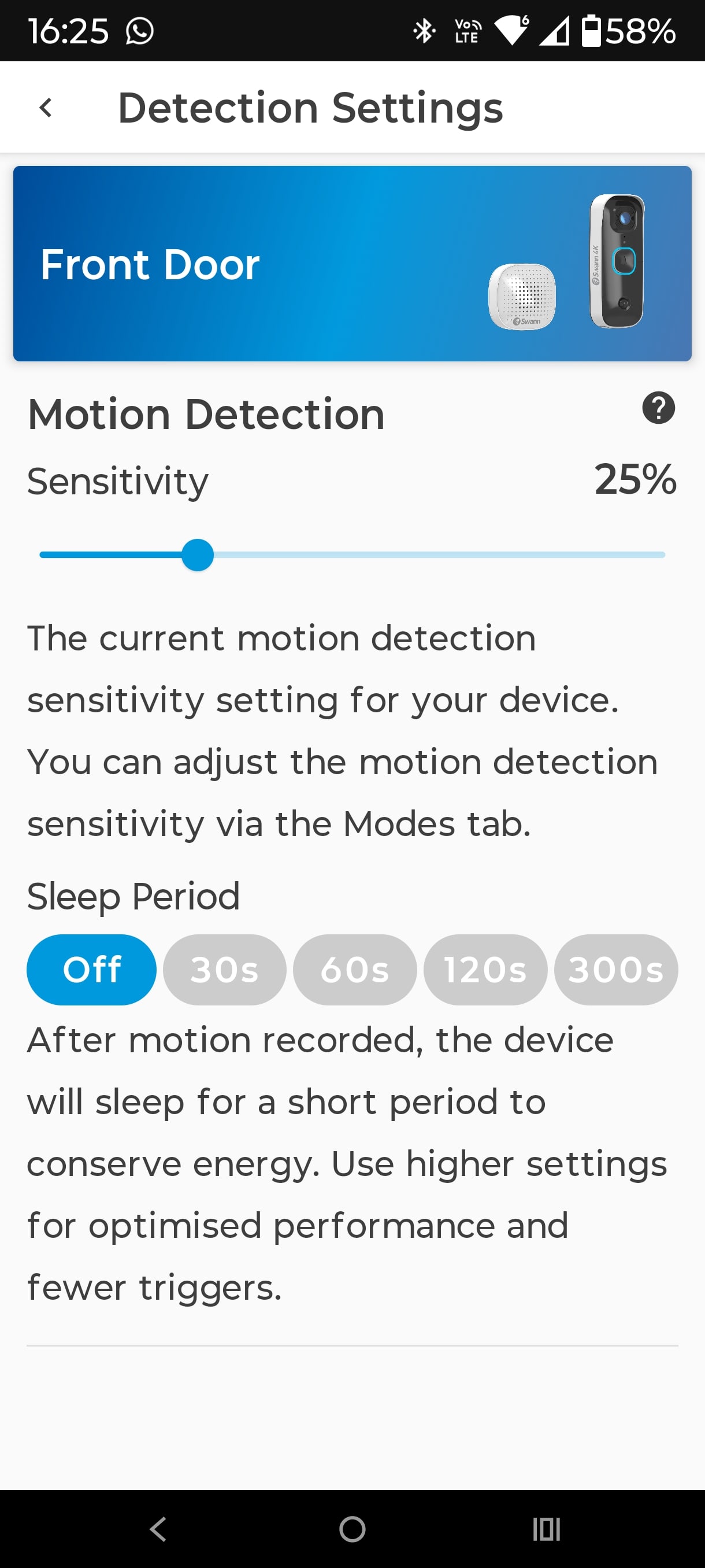 • Change PIR settings – off, close, med, far, max (the more sensitive, the higher the battery drain), but it can be handy to reduce false positives from further away.