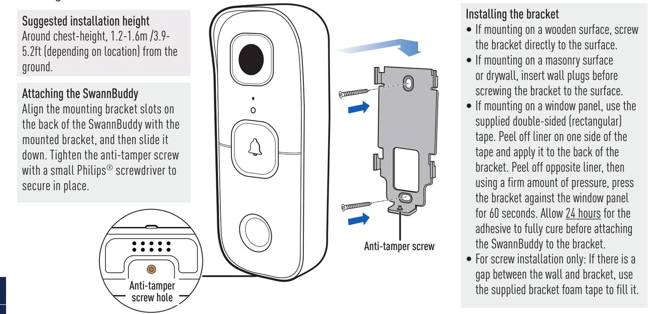Swannbuddy needs to be at chest height – 1.6m from the ground – and as close to the door handle as possible. While it has a 165° vertical field-of-view, the smartphone image crops to reduce the fisheye effect. Inbox is a flat mounting bracket and wall-plug/screws, or you can use the self-adhesive pads (not on masonry), but that means it is easier to steal the device. You may want to angle it towards the door by packing out one edge of the mount.