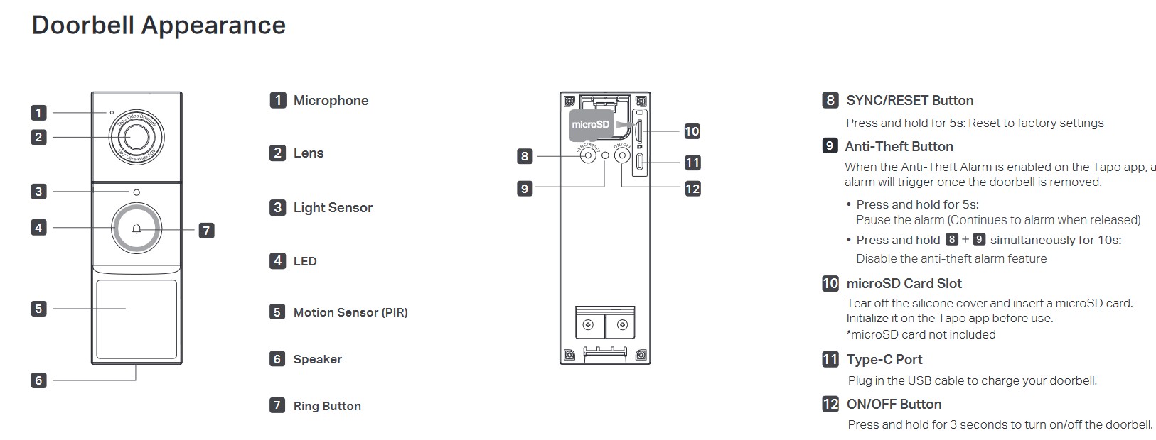 The Tapo D235 Doorbell is 150 × 50 × 38.4 mm has a 180° camera sensor (good), push button (which doubles as a light source), two IR LEDs, a PIR (passive infrared) motion detector, and 512GB micro-SD slot. It comes with all the mounting hardware. I like the IP66 weather resistance (many have only IP65 or less) and the anti-theft feature, as it’s all too easy to rip doorbells (all brands) off the mount.