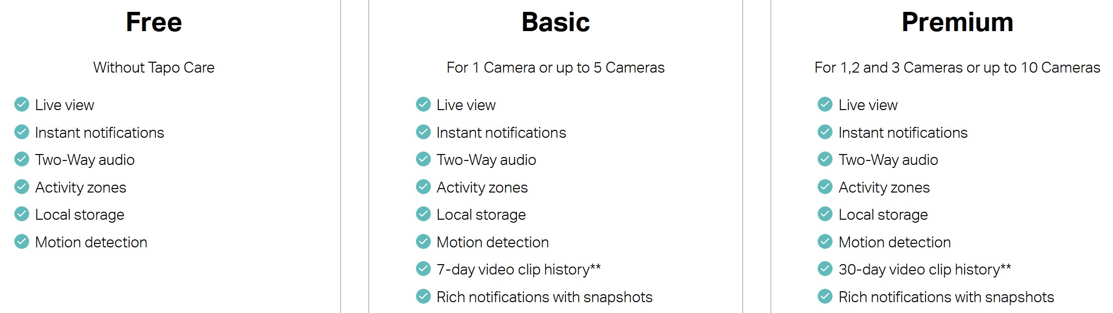 You can subscribe to Tapocare Premium, 30-day storage (there are no lower-cost 7-day options on the website). You must provide a credit card, and payment automatically rolls over. Prices exclude any promotions or incentives after a 30-day trial period.