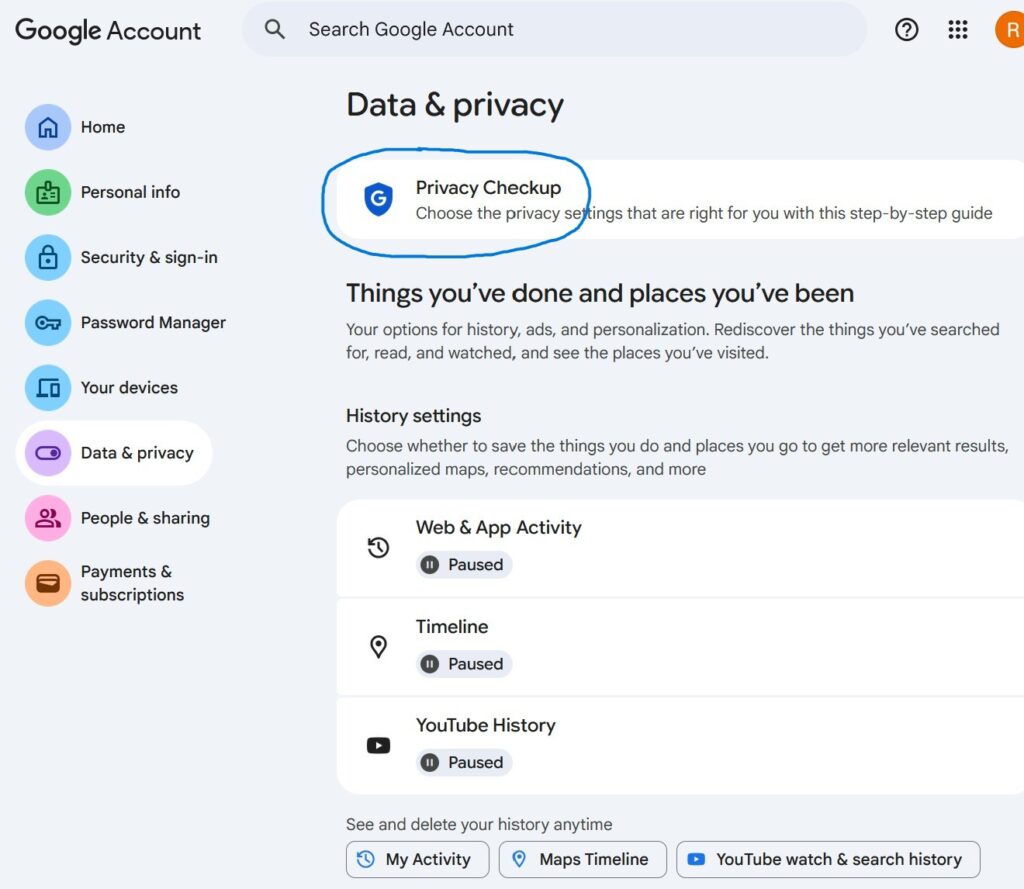 The first place to start is to sign in to your Google Account. If you have multiple Google accounts (Gmail addresses), you will need to do this on each. Select Data & Privacy, and don’t worry, you cannot stuff this up.