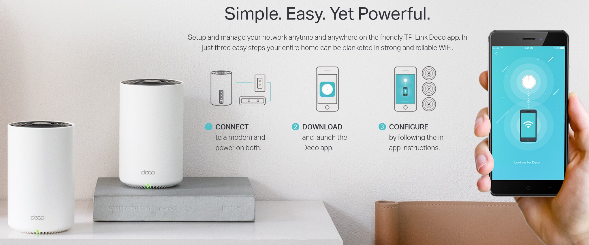 First step: Move your modem/router to the centre of the home. If you don’t have Ethernet, a pair of Powerline adapters can facilitate that.