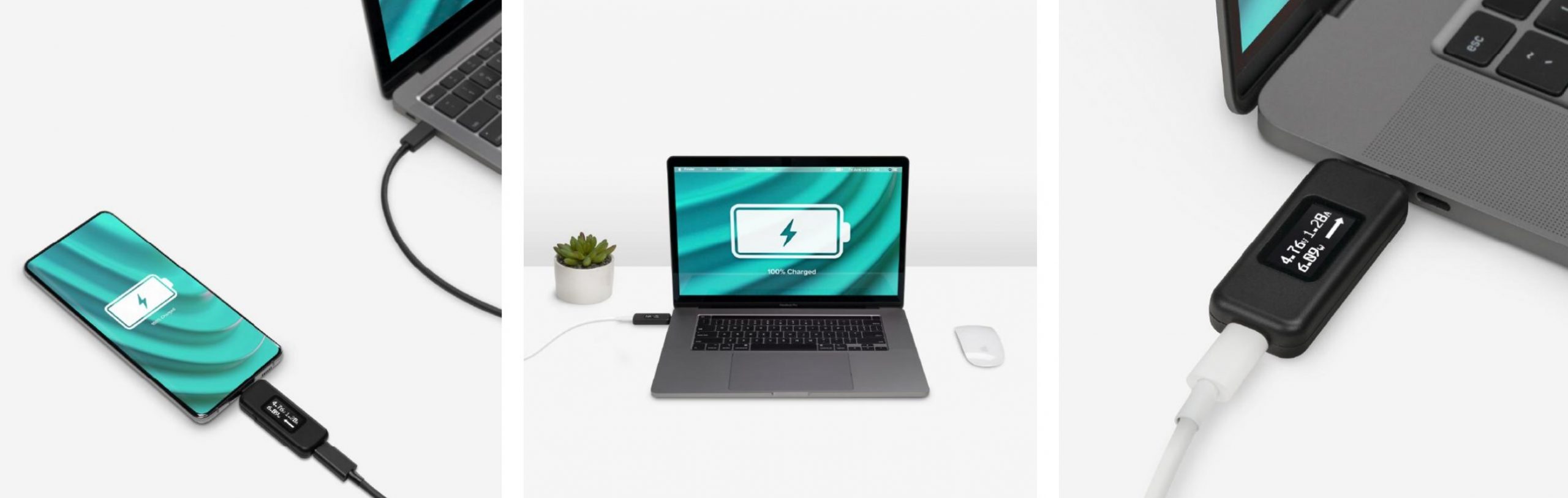 This is a new USB-C model that can measure DC volts (45.-50V), amps (50mA-6.5A) and watts to 240W EPR (extended power range). It works on all USBs from 1.0 (need a USB-A adapter) to USB-C 3.2 Gen 2. It will not work with Thunderbolt 3 or 4 ports but will work on the USB ports in any attached dock or dongle. Power-testing does not interfere with normal USB-C operation as it only taps into the power (VBUS) and ground connections to measure values and leaves the data lines untouched.